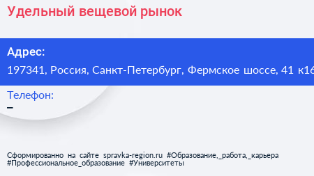 Удельный, вещевой рынок по адресу 197341, Россия, Санкт-Петербург, Фермское шоссе, 41 к16 в дальнейшем Организация, размещена в следующих категориях: