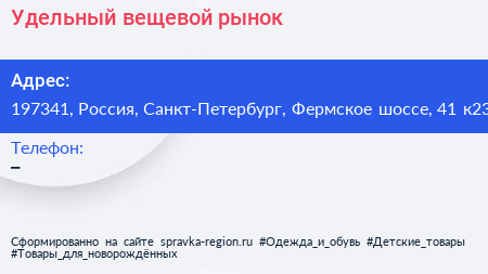 Удельный, вещевой рынок по адресу 197341, Россия, Санкт-Петербург, Фермское шоссе, 41 к23 в дальнейшем Организация, размещена в следующих категориях: