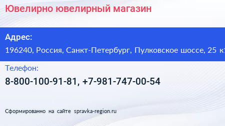Ювелирно, ювелирный магазин по адресу 196240, Россия, Санкт-Петербург, Пулковское шоссе, 25 к1 в дальнейшем Организация, размещена в следующих категориях: