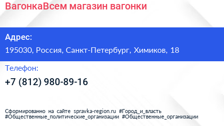 ВагонкаВсем, магазин вагонки по адресу 195030, Россия, Санкт-Петербург, Химиков, 18 в дальнейшем Организация, размещена в следующих категориях: