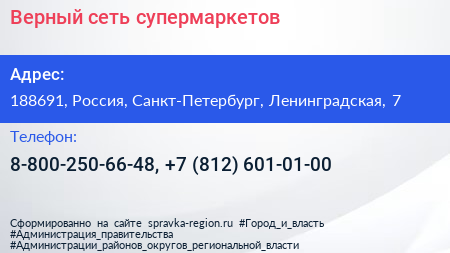 Верный, сеть супермаркетов по адресу 188691, Россия, Санкт-Петербург, Ленинградская, 7 в дальнейшем Организация, размещена в следующих категориях: