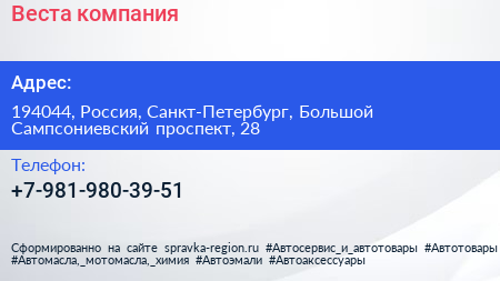 Веста, компания по адресу 194044, Россия, Санкт-Петербург, Большой Сампсониевский проспект, 28 в дальнейшем Организация, размещена в следующих категориях: