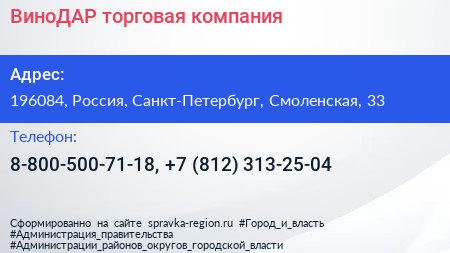 ВиноДАР, торговая компания по адресу 196084, Россия, Санкт-Петербург, Смоленская, 33 в дальнейшем Организация, размещена в следующих категориях: