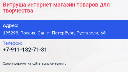 Витруша, интернет-магазин товаров для творчества по адресу 195299, Россия, Санкт-Петербург, Руставели, 66 в дальнейшем Организация, размещена в следующих категориях: