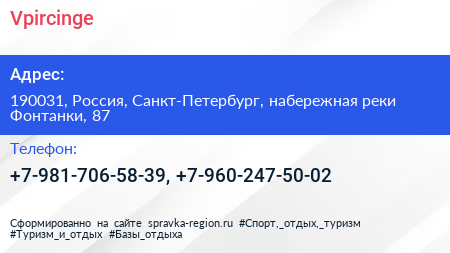 Vpircinge по адресу 190031, Россия, Санкт-Петербург, набережная реки Фонтанки, 87 в дальнейшем Организация, размещена в следующих категориях: