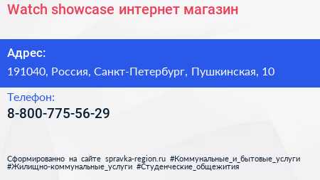 Watch-showcase, интернет-магазин по адресу 191040, Россия, Санкт-Петербург, Пушкинская, 10 в дальнейшем Организация, размещена в следующих категориях:
