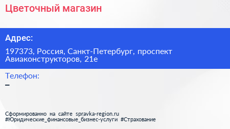 Цветочный магазин по адресу 197373, Россия, Санкт-Петербург, проспект Авиаконструкторов, 21е в дальнейшем Организация, размещена в следующих категориях: