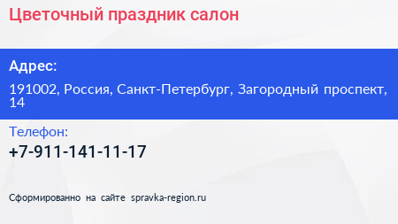 Цветочный праздник, салон по адресу 191002, Россия, Санкт-Петербург, Загородный проспект, 14 в дальнейшем Организация, размещена в следующих категориях: