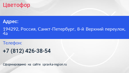 Цветофор по адресу 194292, Россия, Санкт-Петербург, 8-й Верхний переулок, 4а в дальнейшем Организация, размещена в следующих категориях: