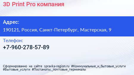 3D Print Pro, компания по адресу 190121, Россия, Санкт-Петербург, Мастерская, 9 в дальнейшем Организация, размещена в следующих категориях: