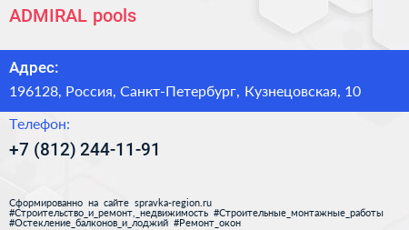 ADMIRAL pools по адресу 196128, Россия, Санкт-Петербург, Кузнецовская, 10 в дальнейшем Организация, размещена в следующих категориях: