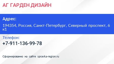 АГ ГАРДЕН ДИЗАЙН по адресу 194354, Россия, Санкт-Петербург, Северный проспект, 6 к1 в дальнейшем Организация, размещена в следующих категориях: