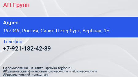 АП Групп по адресу 197349, Россия, Санкт-Петербург, Вербная, 1Б в дальнейшем Организация, размещена в следующих категориях:
