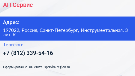 АП-Сервис по адресу 197022, Россия, Санкт-Петербург, Инструментальная, 3 лит К в дальнейшем Организация, размещена в следующих категориях:
