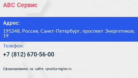 АВС-Сервис по адресу 195248, Россия, Санкт-Петербург, проспект Энергетиков, 19 в дальнейшем Организация, размещена в следующих категориях: