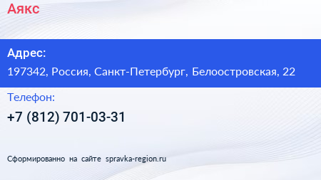 Аякс по адресу 197342, Россия, Санкт-Петербург, Белоостровская, 22 в дальнейшем Организация, размещена в следующих категориях: