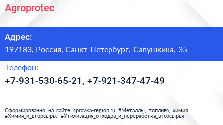 Agroprotec по адресу 197183, Россия, Санкт-Петербург, Савушкина, 35 в дальнейшем Организация, размещена в следующих категориях: