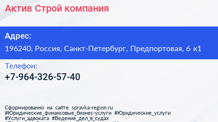 Актив-Строй, компания по адресу 196240, Россия, Санкт-Петербург, Предпортовая, 6 к1 в дальнейшем Организация, размещена в следующих категориях: