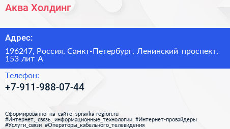Аква-Холдинг по адресу 196247, Россия, Санкт-Петербург, Ленинский проспект, 153 лит А в дальнейшем Организация, размещена в следующих категориях: