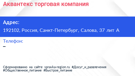 Аквантекс, торговая компания по адресу 192102, Россия, Санкт-Петербург, Салова, 37 лит А в дальнейшем Организация, размещена в следующих категориях: