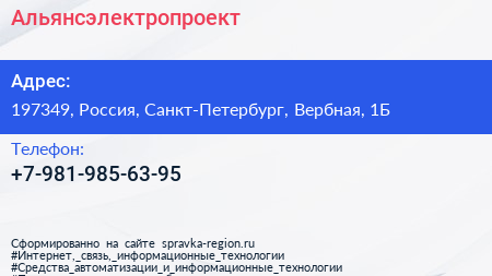 Альянсэлектропроект по адресу 197349, Россия, Санкт-Петербург, Вербная, 1Б в дальнейшем Организация, размещена в следующих категориях: