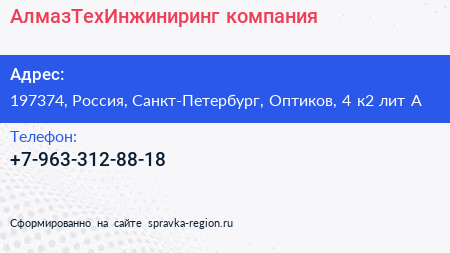 АлмазТехИнжиниринг, компания по адресу 197374, Россия, Санкт-Петербург, Оптиков, 4 к2 лит А в дальнейшем Организация, размещена в следующих категориях: