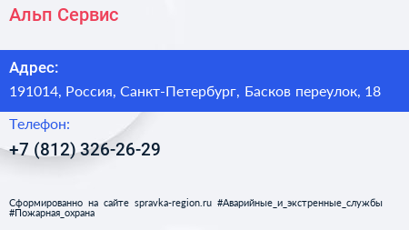 Альп-Сервис по адресу 191014, Россия, Санкт-Петербург, Басков переулок, 18 в дальнейшем Организация, размещена в следующих категориях: