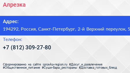 Алрезка по адресу 194292, Россия, Санкт-Петербург, 2-й Верхний переулок, 5 в дальнейшем Организация, размещена в следующих категориях: