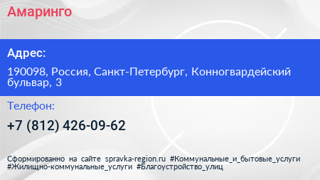 Амаринго по адресу 190098, Россия, Санкт-Петербург, Конногвардейский бульвар, 3 в дальнейшем Организация, размещена в следующих категориях:
