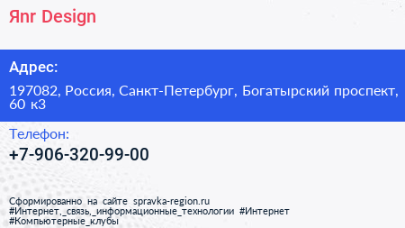 Яnr Design по адресу 197082, Россия, Санкт-Петербург, Богатырский проспект, 60 к3 в дальнейшем Организация, размещена в следующих категориях:
