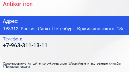 Antikor-iron по адресу 193312, Россия, Санкт-Петербург, Кржижановского, 18г в дальнейшем Организация, размещена в следующих категориях: