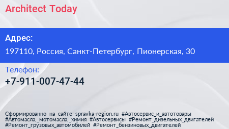 Architect Today по адресу 197110, Россия, Санкт-Петербург, Пионерская, 30 в дальнейшем Организация, размещена в следующих категориях: