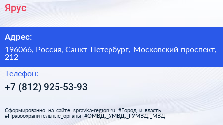 Ярус по адресу 196066, Россия, Санкт-Петербург, Московский проспект, 212 в дальнейшем Организация, размещена в следующих категориях: