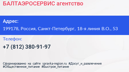 БАЛТАЭРОСЕРВИС, агентство по адресу 199178, Россия, Санкт-Петербург, 18-я линия В.О., 53 в дальнейшем Организация, размещена в следующих категориях: