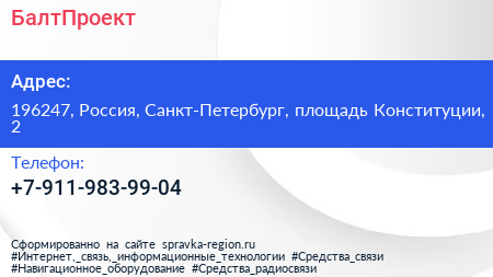 БалтПроект по адресу 196247, Россия, Санкт-Петербург, площадь Конституции, 2 в дальнейшем Организация, размещена в следующих категориях: