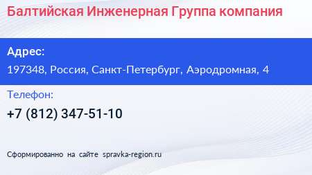 Балтийская Инженерная Группа, компания по адресу 197348, Россия, Санкт-Петербург, Аэродромная, 4 в дальнейшем Организация, размещена в следующих категориях: