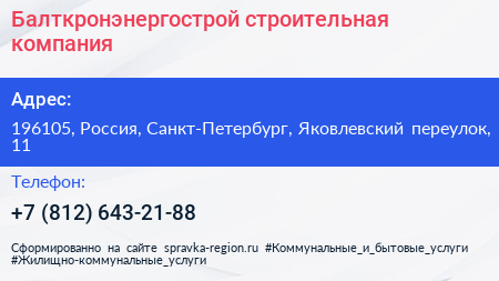 Балткронэнергострой, строительная компания по адресу 196105, Россия, Санкт-Петербург, Яковлевский переулок, 11 в дальнейшем Организация, размещена в следующих категориях: