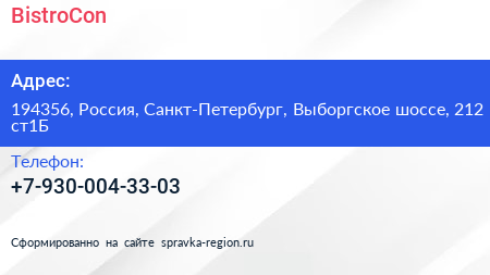 BistroCon по адресу 194356, Россия, Санкт-Петербург, Выборгское шоссе, 212 ст1Б в дальнейшем Организация, размещена в следующих категориях: