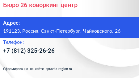 Бюро 26, коворкинг-центр по адресу 191123, Россия, Санкт-Петербург, Чайковского, 26 в дальнейшем Организация, размещена в следующих категориях: