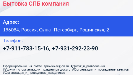 Бытовка СПБ, компания по адресу 196084, Россия, Санкт-Петербург, Рощинская, 2 в дальнейшем Организация, размещена в следующих категориях: