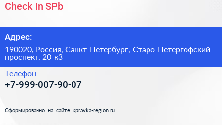 Check In SPb по адресу 190020, Россия, Санкт-Петербург, Старо-Петергофский проспект, 20 к3 в дальнейшем Организация, размещена в следующих категориях: