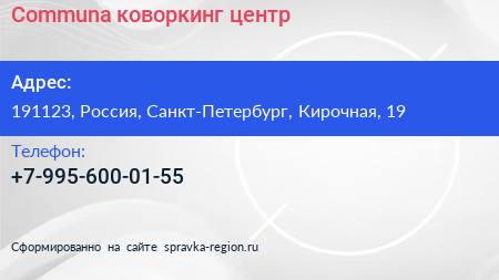Communa, коворкинг-центр по адресу 191123, Россия, Санкт-Петербург, Кирочная, 19 в дальнейшем Организация, размещена в следующих категориях:
