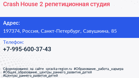 Crash House 2, репетиционная студия по адресу 197374, Россия, Санкт-Петербург, Савушкина, 85 в дальнейшем Организация, размещена в следующих категориях: