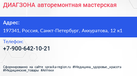 ДИАГЗОНА, авторемонтная мастерская по адресу 197341, Россия, Санкт-Петербург, Аккуратова, 12 к1 в дальнейшем Организация, размещена в следующих категориях: