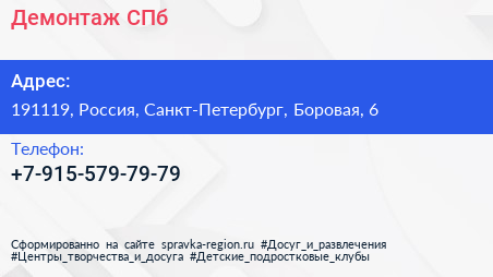 Демонтаж СПб по адресу 191119, Россия, Санкт-Петербург, Боровая, 6 в дальнейшем Организация, размещена в следующих категориях: