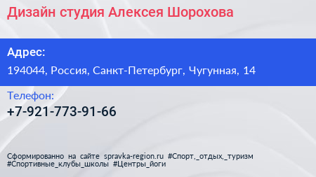 Дизайн-студия Алексея Шорохова по адресу 194044, Россия, Санкт-Петербург, Чугунная, 14 в дальнейшем Организация, размещена в следующих категориях:
