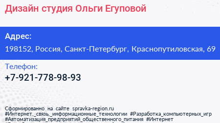 Дизайн-студия Ольги Егуповой по адресу 198152, Россия, Санкт-Петербург, Краснопутиловская, 69 в дальнейшем Организация, размещена в следующих категориях: