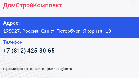ДомСтройКомплект по адресу 195027, Россия, Санкт-Петербург, Якорная, 13 в дальнейшем Организация, размещена в следующих категориях: