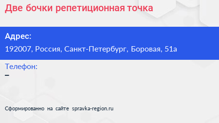 Две бочки, репетиционная точка по адресу 192007, Россия, Санкт-Петербург, Боровая, 51а в дальнейшем Организация, размещена в следующих категориях: