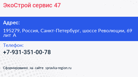 ЭкоСтрой сервис 47 по адресу 195279, Россия, Санкт-Петербург, шоссе Революции, 69 лит А в дальнейшем Организация, размещена в следующих категориях: